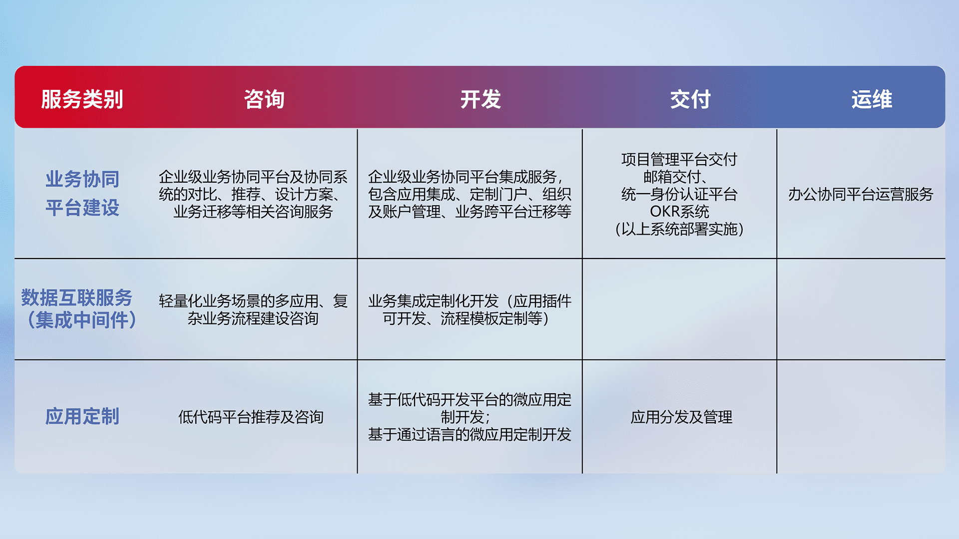 针对钉钉、、、企微、、、IDaas等平台级产品提供产品的规划、、、方案、、交付、、、、定制化开发等服务,,实现如统一协同办公、、、智能客户服务、、、混合会议管理、、、智能数据查询、、、等业务场景,,,实现数字化转型。。。。