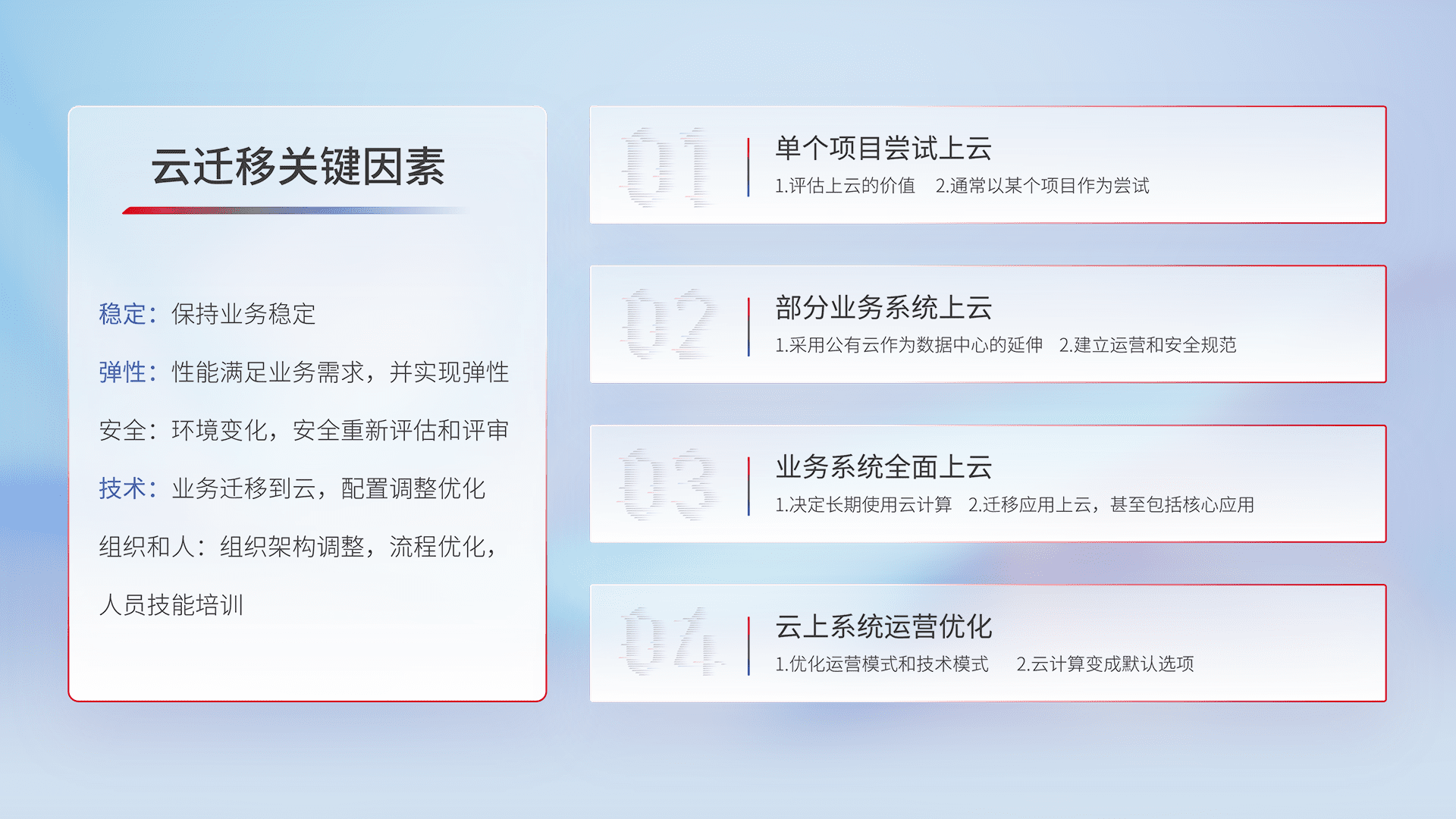 结合实际业务,,从规划设计、、、、云平台选型、、云原生改造、、、、数据迁移、、、、集成交付,,,迁移全过程为客户识别最佳上云路径,,做好风险识别管理,,设计网络架构、、、身份权限、、安全审计合规、、、、操作审计、、、日志审计、、、、监控告警策略、、、、多站点容灾设计等,,,,对云上基础设施进行整体规划,,,,提升IT治理水平,,,以满足弹性、、、、高可用、、、高性能的需求。。。。