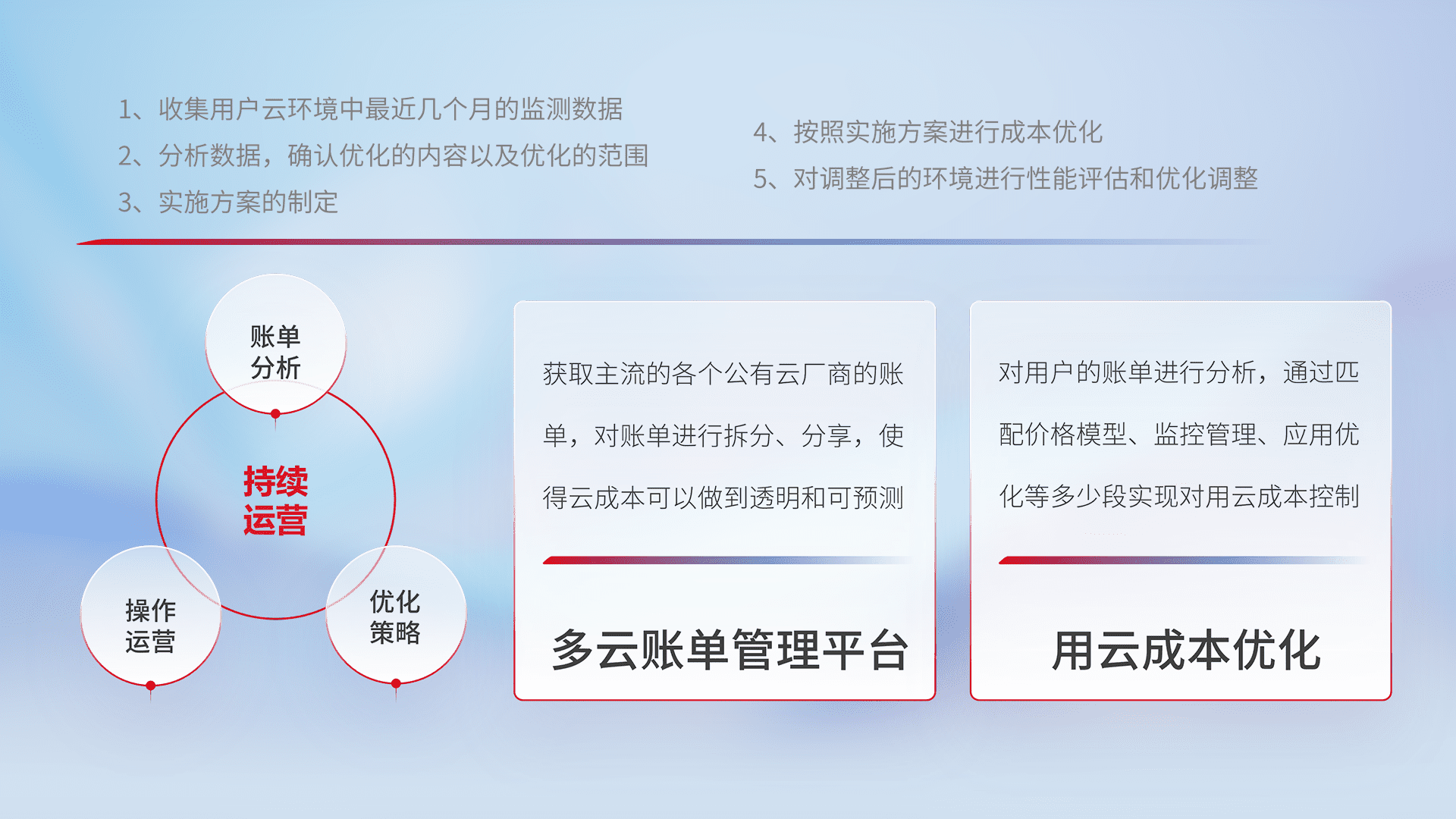 通过多云纳管,,,以统一的资源数据模型把客户的云资源进行抽象和封装,,进而实现对多云资源的统一操作,,,,保障云资源管理的可靠性、、稳定性与可用性。。。。量身定制化运维内容,,,配置、、开发运维、、、补丁管理、、、备份、、、监控、、认证和访问管理、、审计和日常巡检等,,,保障在用云过程中的可靠度,,,,稳定度以及高可用率。。