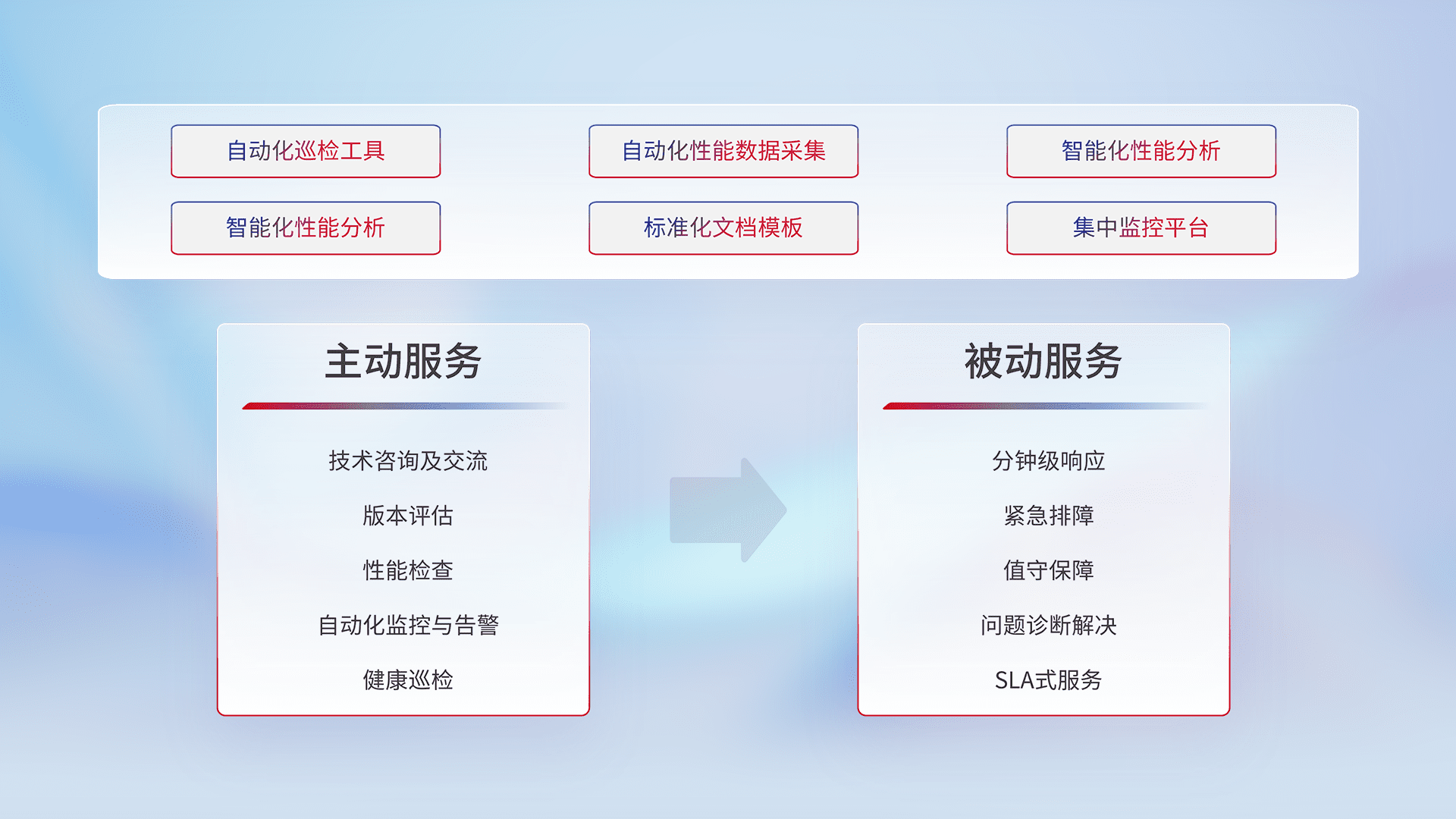 智能化工具和标准化文档,,,,保障服务质量,,,提供主动服务(包含技术咨询、、、、版本评估、、、、性能检查、、、自动化监控与告警、、健康巡检)和被动服务包含(分钟级响应、、紧急排障、、、值守保障、、、问题诊断解决、、、SLA服务)。。。。